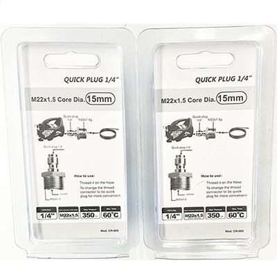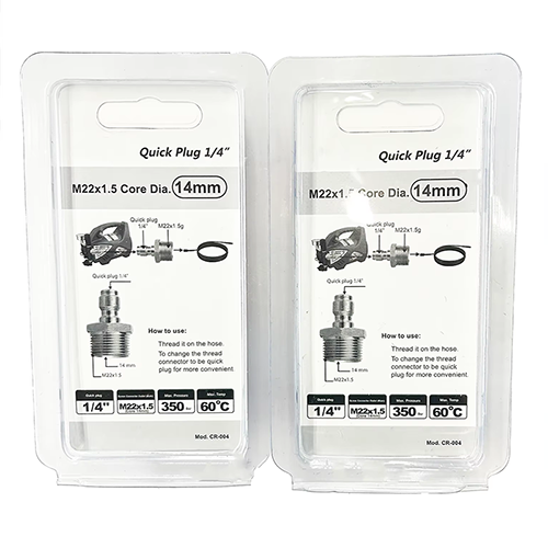 Ved højtryksrensningsarbejde er den stabile tilslutning af udstyret meget vigtig. Størrelsesdesignet på dette 1/4 tommer M22x1,5 Quick Release Plug er meget nøjagtigt. Den ene ende er en 1/4 prop med en diameter på 11,7 mm. Quick-plug strukturen tillader tilslutningen, og demontering er mere bekvem. For fagfolk kan det forbedre arbejdseffektiviteten. For almindelige individuelle brugere kan det også gøre processen nemmere at bruge uden komplicerede værktøjer til installation. Den anden ende er han M22×1,5, med en diameter på 22 mm. Samtidig kan der vælges to åbninger: kerne dia.14mm og core dia.14mm. Standardgevindspecifikationerne for M22×1,5 kan matches med en række forskellige rengøringsudstyr. Der er ingen grund til at bekymre sig om de ekstra omkostninger forårsaget af den uhensigtsmæssige grænseflade, og kompatibiliteten er stærkere. Valget af to åbninger på 14 mm eller 15 mm kan vælges efter forskellige arbejdsbehov, og betjeningen er mere fleksibel.