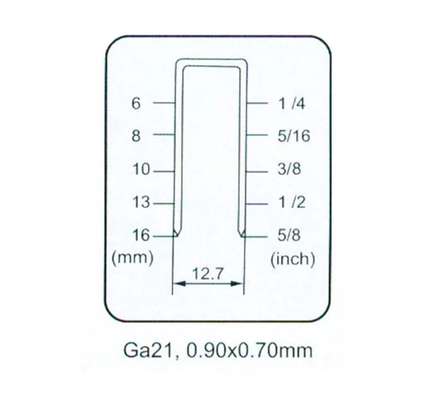 8016 Series Air Staplers inkluderer hovedsageligt 8016b Air Fine Crown Stapler, 8016c Air Fine Crown Stapler, 8016ln (Long Nose) Air Fine Crown Stapler, som alle er klassiske tunge luftneglepistoler. Egnet negle GA21, 0,90x0,70 mm, skulderafstand 12,7 mm, neglehøjde kan være 6 mm, 8 mm, 10 mm, 13 mm, 16 mm (1/4, 5/16, 3/8, 1/2, 5/8 tommer).