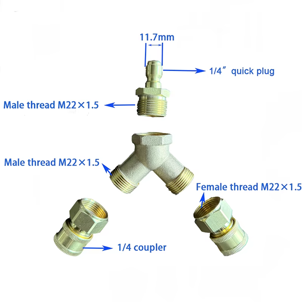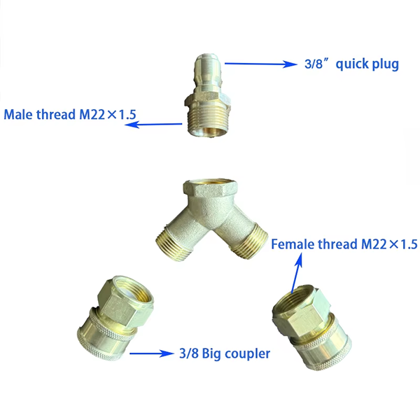 Der er to modeller, den første er et trevejs stik med 1/4 "stik og 2 stk 1/4" koblinger. Den ene ende af 1/4 "-stikket har et hurtigt stik -design med en diameter på 11,7 mm, og den anden ende er mandlig tråd M22 × 1,5. Den ene ende af de to 1/4" koblinger er kvindelig tråd M22 × 1,5, og den anden ende er 1/4 kobling. Den anden er et trevejs stik med 3/8 "stik og 2 stk 3/8" koblinger.3/8 "stik. Den ene ende er også et hurtigt stik-design, og den anden ende er han. Tråd M22 × 1,5. Den ene ende af de to 3/8" koblinger er huntråd M22 × 1,5, og den anden ende er 3/8 stor kobling. Materialet er fuldt kobber, som har god korrosionsmodstand og kan opretholde en stabil forbindelse i det komplekse miljø med bilvask. På samme tid har kobber også en vis styrke og fremragende duktilitet, som er et pålideligt valg til rengøringsmiljøer med højt tryk. Størrelsen på 1/4-tommer kan tilpasses fleksibelt til bilvaskemaskiner, spraypistoler og andet udstyr. Specifikationen på 3/8-tommer kan anvendes til brugen af større strømning, såsom rengøring af store køretøjer eller rengøring af industrielt udstyr, hvilket forbedrer effektiviteten af rengøring.