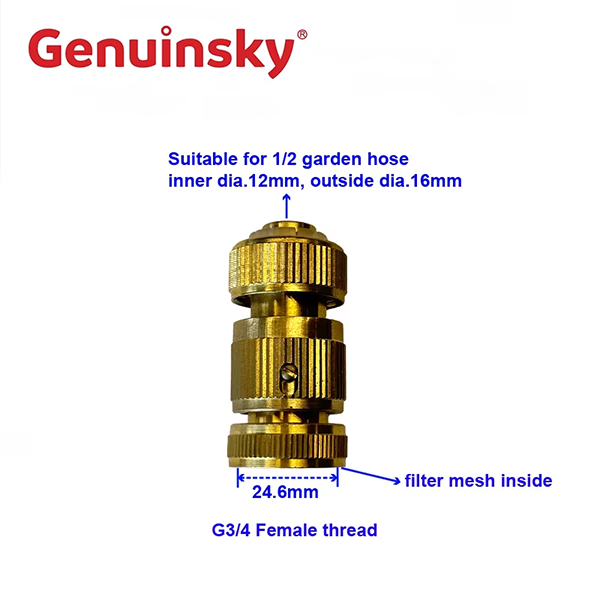 Trykskørens indløbstik er en forbindelsesdel af vandindløbsenden af den højtryksskive, der bruges meget i dagligdagen. Det er velegnet til 1/2 haveslange, indre dia.12mm, uden for dia.1 6mm, den anden ende er G3/4 huntråd med en diameter på 24,6 mm, og der er et filternet inde.