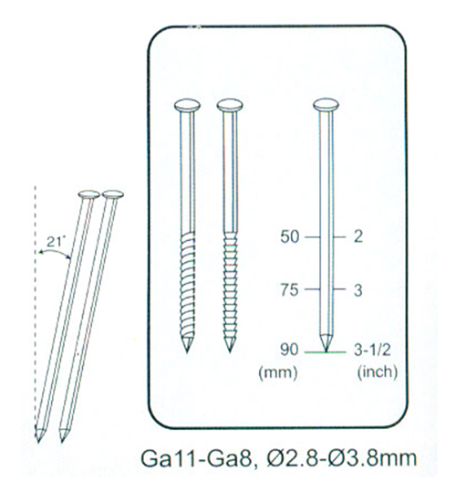 Negnespecifikationerne er GA11-GA8, med diameter 2,8-3,8 mm og længder typisk på 50 mm, 75 mm og 90 mm (2-tommer, 3-tommer, 3-1/2-tommer). Neglarrangementets hældningsvinkel er 21 grader. Negledybden kan justeres efter arbejdsbehov.