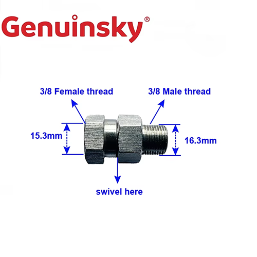 Denne drejelige fitting af rustfrit stål er 3/8 huntråd i den ene ende med en diameter på ca. 15,3 mm og 3/8 mandlig tråd i den anden ende med en diameter på ca. 16,3 mm. Især kan den midterste del drejes. Denne funktion kan tilpasses til højtryksslangen og spraypistolen med bilvaskudstyr. I rengøringsoperationen kan forskellige vinkler justeres i henhold til brug, hvilket kan løse problemet med rørforvrængning. Med rotationsstrukturen kan fleksibel forbindelse realiseres.