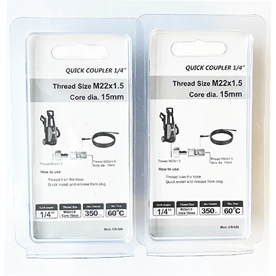 1/4 kobling af disse to specifikationer har forskellige størrelsesdesign. Den ene er M22 × 1,5, med en diameter på 22 mm, hvoraf kernen dia.15mm. Den anden er M14 × 1,5 med en diameter på 14 mm og et konisk hul. Designet af de to størrelser af produktet er meget præcist, som kan tilpasses nøjagtigt til de relevante matchende rengøringsmaskiner og bruges til højtryksvask -pistolslangestik. Materialet i selve produktet er messing. Messingmaterialet har god korrosionsbestandighed. Rengøringsarbejde med højt tryk skal ofte møde et fugtigt miljø. Derfor kan produktets korrosionsmodstand selv arbejde normalt i mange hårde arbejdsmiljøer. På samme tid har messing god duktilitet og hårdhed, og i højtryksvandstrømmen kan vandets holdbarhed også opretholdes i virkningen, og det er ikke let at bryde, hvilket forårsager vandlækage og reducerer omkostningerne ved udskiftning af udstyr. Kommer til brugsscenarier inkluderer rengøring af hjem, industriel udstyr eller rengøring af udendørs facilitet. Under disse rengøringsprocesser kan installation eller adskillelse udføres hurtigt. Brugere kan hurtigt afslutte forbindelsesarbejdet uden hjælp fra værktøjer, hvilket forbedrer arbejdseffektiviteten i høj grad og sparer tid. På samme tid er størrelsen på 1/4 koblingen af disse to specifikationer også meget passende. Brugere kan let og fleksibelt afslutte forbindelsesoperationen med en hånd.